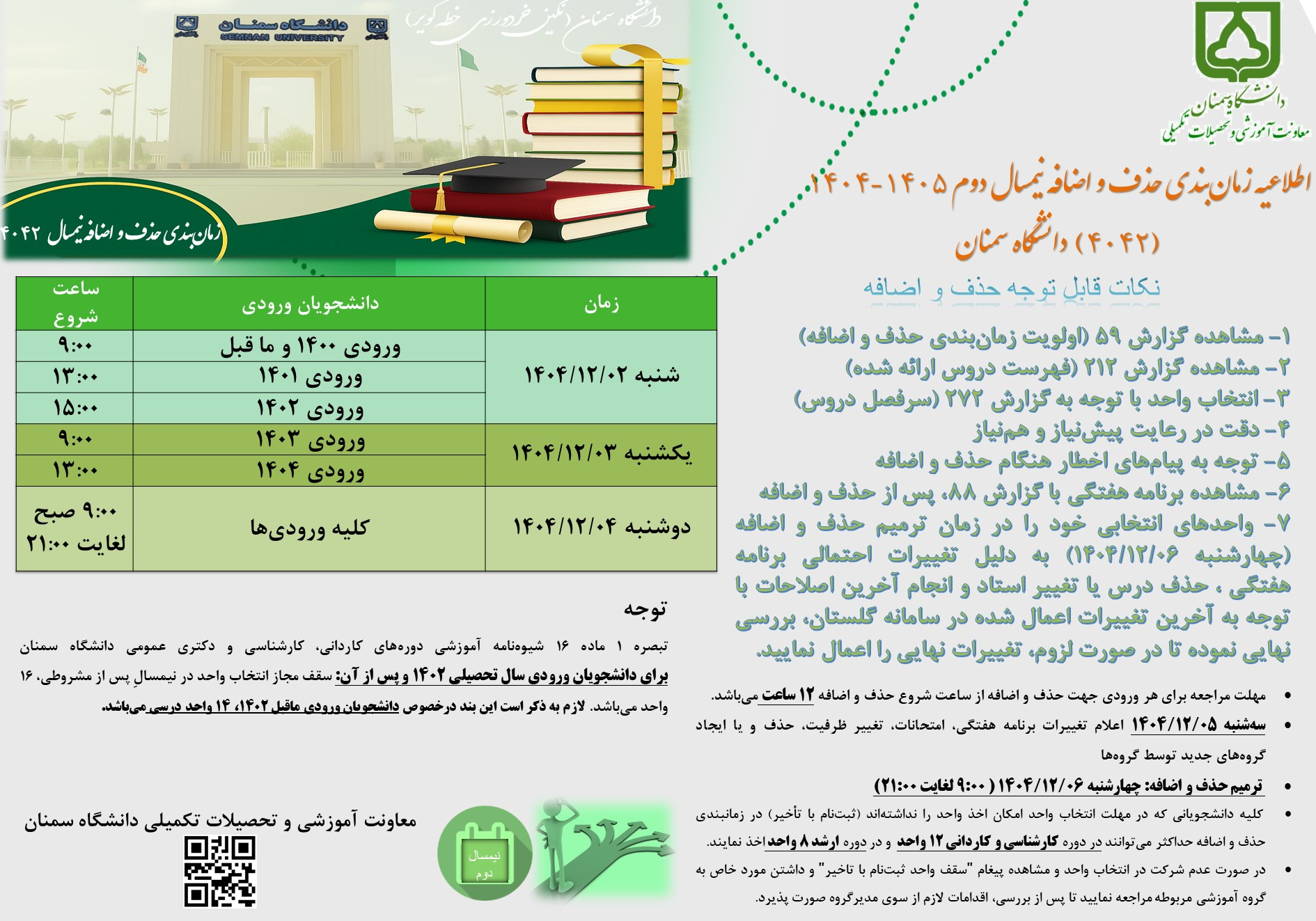 زمان بندی حذف و اضافه نیمسال دوم 1405-1404 (4042)