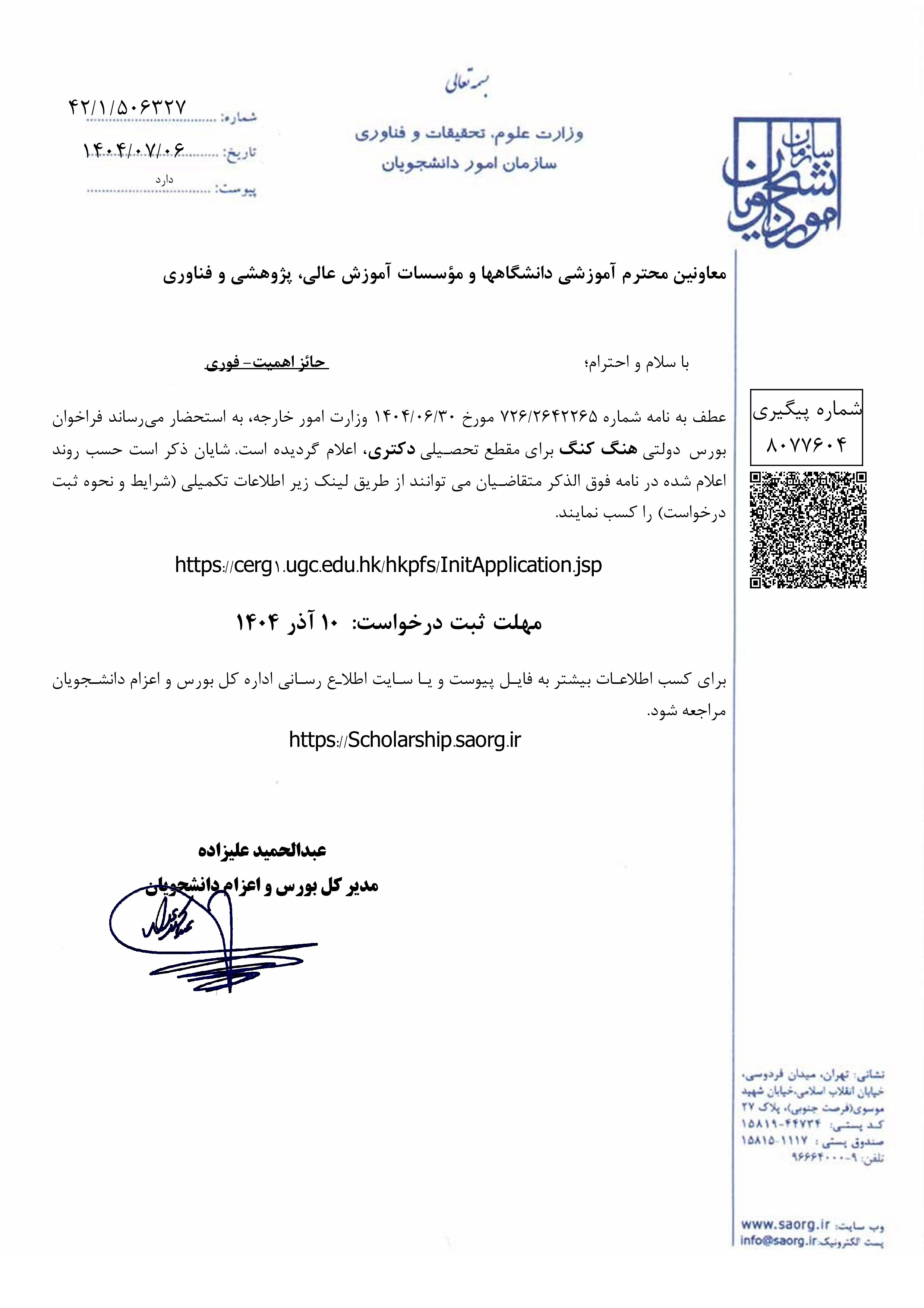 اعلام فراخوان بورس تحصیلی هنگ کنگ