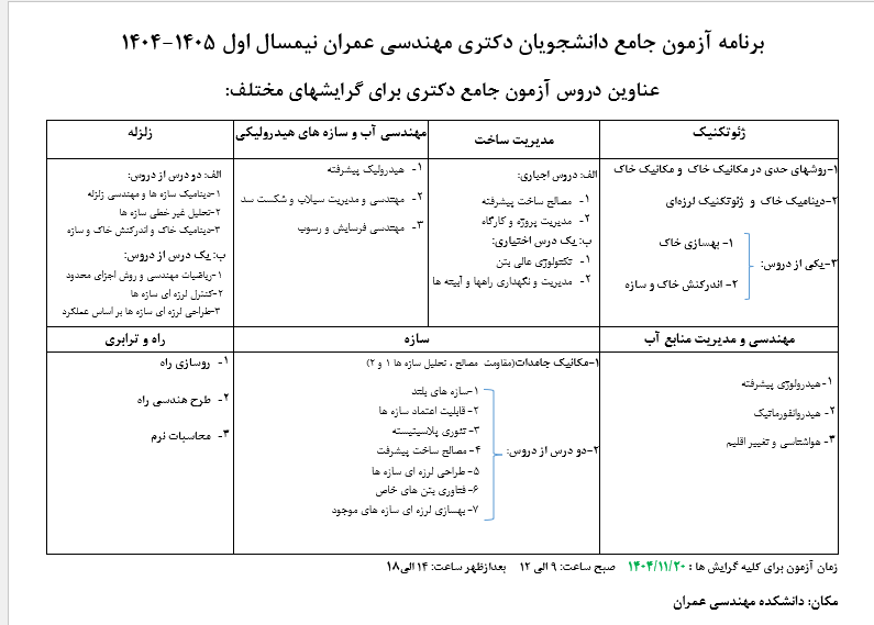 برنامه آزمون جامع دانشجویان دکتری مهندسی عمران نیمسال اول 1405-1404